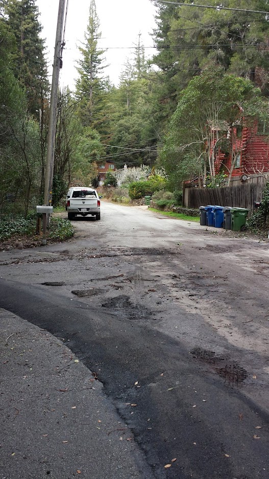 other side of the street, coming down to the street in places. Across from our carport, a small paved road rises in a V, the slopes of which were burned but have been hydroseeded. The redwood trees all survived, many with charred trunks but new growth from their roots and crowns. California oaks also fared well, and their deep tap roots are great for stabilizing hillsides. I concluded that our property would likely fare well, with muddy floors at worst, but that the streets at either end of our block were at risk of being closed and we’d be cut off. Okay, evacuation it is.